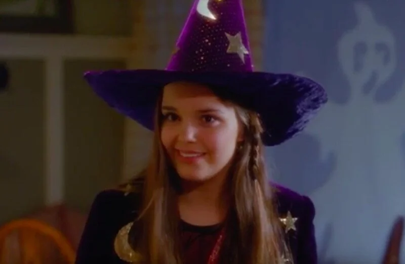 Next I looked to Halloweentown, a favorite of mine. I wouldn’t say that Marnie is much of a fashionista, but a picture of her in a classic moon-and-star patterned witch hat and cloak inspired me to pair the dress with star-patterned tights.